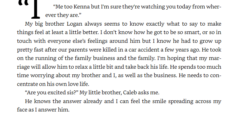 “My little brother Caleb asks me.” There are two ways to handle this construction, and either one is acceptable. Either the name is separated from the rest of the surrounding sentence by two commas, or — because the name is so brief and so closely related to the noun it’s associated with — no commas. But it shouldn’t be set off with just one comma. Compare this with the earlier sentence starting “My big brother Logan always seems…” which is correct, though “My big brother, Logan, always seems…” would also be just fine. In this case, the Snarky Editor opted for consistency by treating both brothers in the same way.