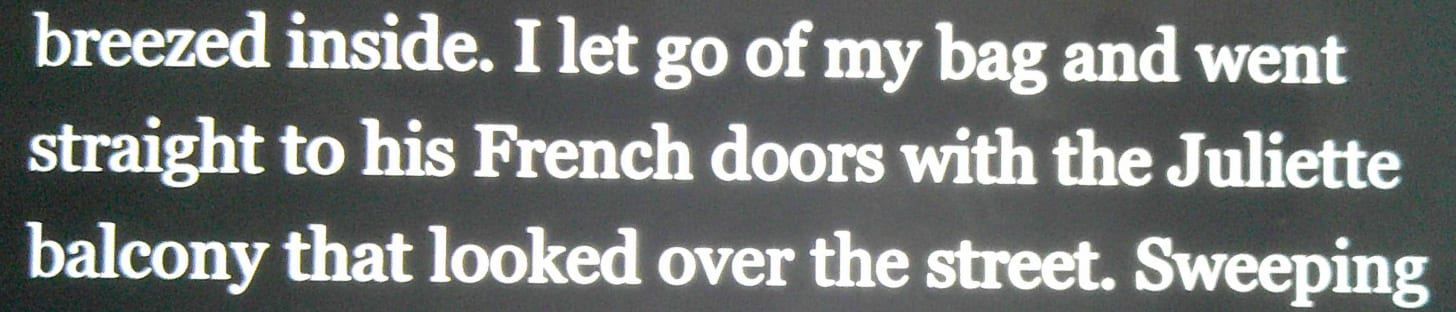 …. his French doors with the Juliette balcony that looked over the street.