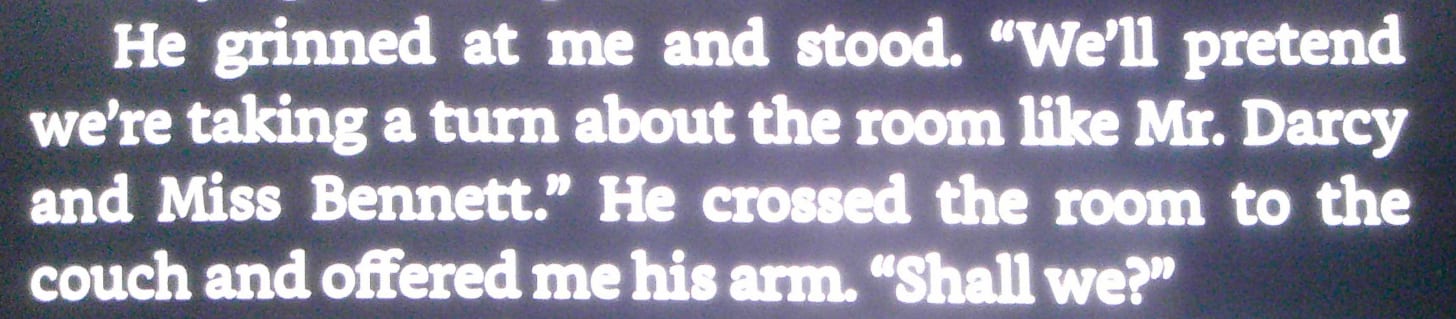 “We’ll pretend we’re taking a turn about the room like Mr. Darcy and Miss Bennett.”