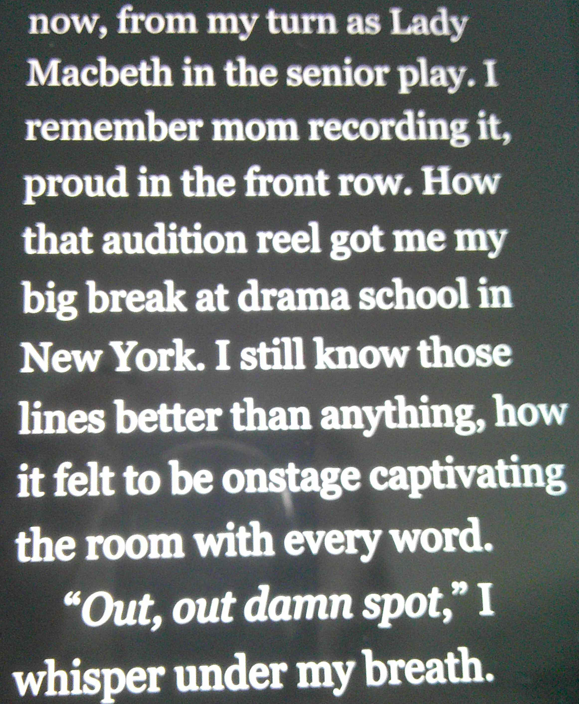 The author could have gotten by with this one if the character wasn’t presented as an experienced actress who has played Lady Macbeth, brags about how well she knows the lines — and therefore damned well ought to know that the line Shakespeare actually wrote is, “Yet here’s a spot. Out, damned spot! Out, I say!”